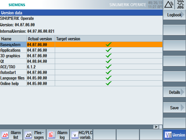 Eine Übersicht über die Versionen der verschiedenen Komponenten in der NC-Steuerung erscheint.