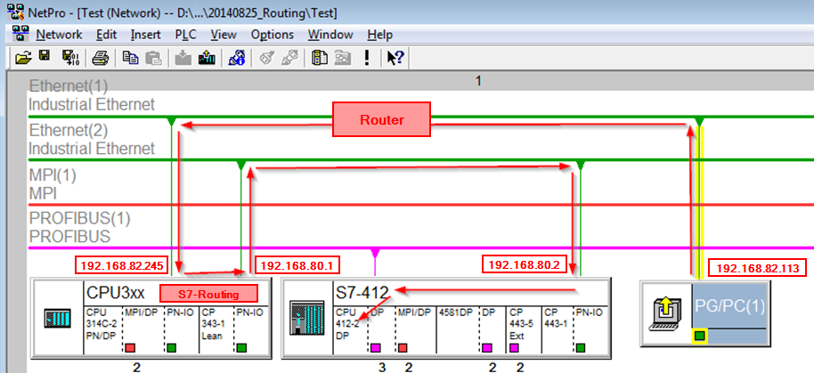 Der Engineering-Rechner (auch mit ibaPDA) soll auf die Steuerung CPU412 zugreifen. Der Rechner und die Steuerung sind nicht direkt miteinander über ein gemeinsames Netzwerk/Bus verbunden. Die Verbindung soll über die Steuerung CPU314C laufen. Das "Durchreichen" der Kommunikation in dieser Steuerung wird als S7-Routing bezeichnet.