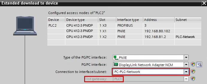 "PLC2" is now connected to the computer via S7 routing via "PLC1".