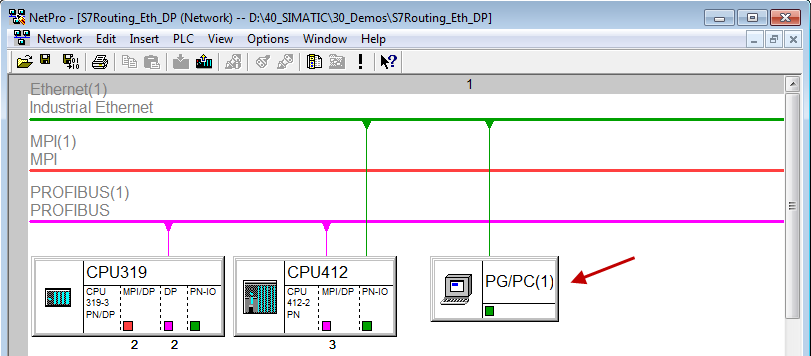 In the following figure, the communication path is shown using arrows (these are not displayed in SIMATIC NetPro).