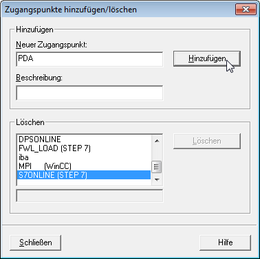 Damit es keine Konflikte mit den Einstellungen von SIMATIC-Manager und ibaPDA gibt, wenn beide Programme auf demselben Rechner laufen, können Sie einen neuen Zugangspunkt definieren.