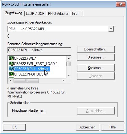 Im Dialogfenster des Moduls gibt es den Button <PG/PC-Schnittstelle einstellen>. Damit öffnen Sie den Dialog zur Einstellung der PG/PC-Schnittstelle.