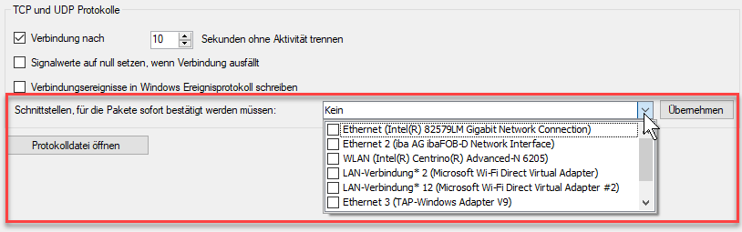 Das "Delayed Acknowledge" lässt sich einzeln pro Netzwerkadapter über einen Eintrag in der Windows Registry abschalten. Zur einfachen Änderung bietet ibaPDA im I/O-Manager unter Allgemein im Register Einstellungen einen entsprechenden Dialog.