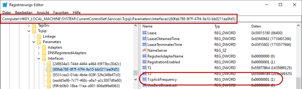 Der Parameter "TcpAckFrequency" (REG_DWORD = 1) wird dadurch im Registry-Pfad der ausgewählten Netzwerkadapter angelegt: