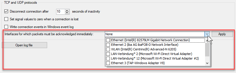 The "delayed acknowledge" can be switched off individually for each network adapter via an entry in the Windows Registry. For easy modification, ibaPDA offers a corresponding dialog in the I/O Manager under General in the tab Settings.