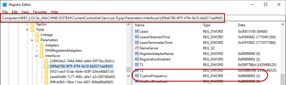 Thus, the parameter "TcpAckFrequency" (REG_DWORD = 1) is created in the registry path of the selected network adapters: