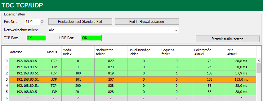 Die Verbindung ist OK, aber der Telegrammzyklus ist wesentlich langsamer als die ibaPDA-Modulzeitbasis. Es ist sinnvoll, die Modulzeitbasis an den Telegrammzyklus anzupassen.