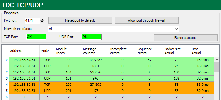 The connection is OK. The ibaPDA module timebase is equally quick or slower than the telegram cycle. The current telegram cycle is shown in the column Time Actual. |