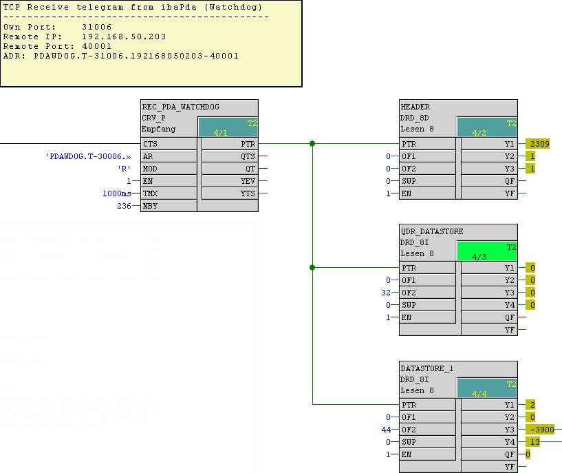 Aus dem Telegrammpuffer wird der Header (Offset 0), die QDR_DATASTORE-Info (Offset 32) und die DATASTORE_1-Info (Offset 44) gelesen.