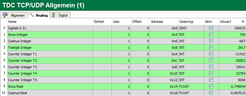 Die Analogsignalen unterstützen verschiedene Datentypen inkl. Texte: SINT, BYTE, INT, WORD, DINT, DWORD, FLOAT, DOUBLE, STRING[32].