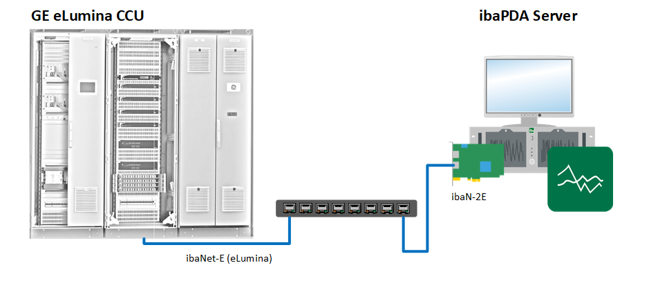 Die ibaN-2E-Karte im ibaPDA-Serverrechner ist mit einem geeigneten Anschluss auf der eLumina CCU verbunden.
