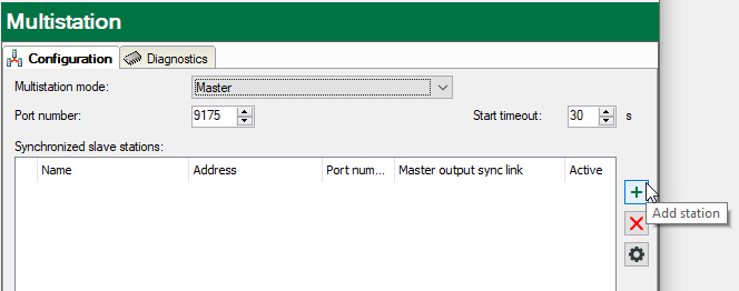 Communication with non-synchronized slaves must also be configured if two multistation masters are to be connected in order to exchange trigger signals via the network ("interstation triggering"). |