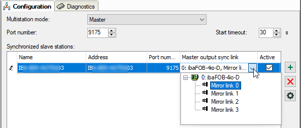 Finally, select the link of an ibaFOB-4o-D output card (mirror module) of the master, which is connected to an input of the ibaFOB-D input card (interrupt master) in the relevant slave. The computer is synchronized via this link.