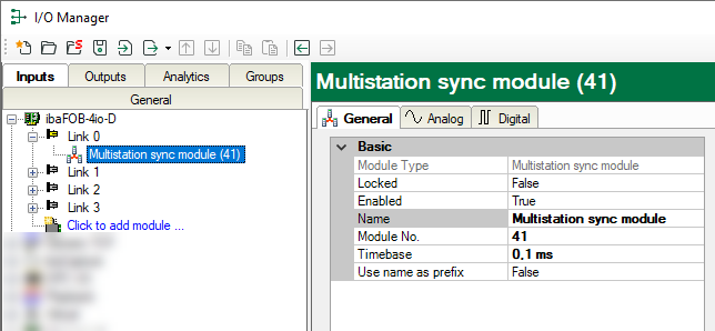 As soon as an ibaPDA system has been set to "Synchronized slave" mode, a "Multistation sync module" is automatically added to the I/O Manager of the relevant participant on the first free link of the ibaFOB-D card (Interrupt Master).