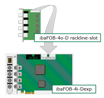 Das ibaFOB-4o-D-Modul muss am Spiegelanschluss der ibaFOB-4i-Dexp-Karte (weißer Stecker auf der Karte) angeschlossen sein. Diese ibaFOB-Karte muss auf Interrupt-Modus "Master-Modus intern" eingestellt werden.