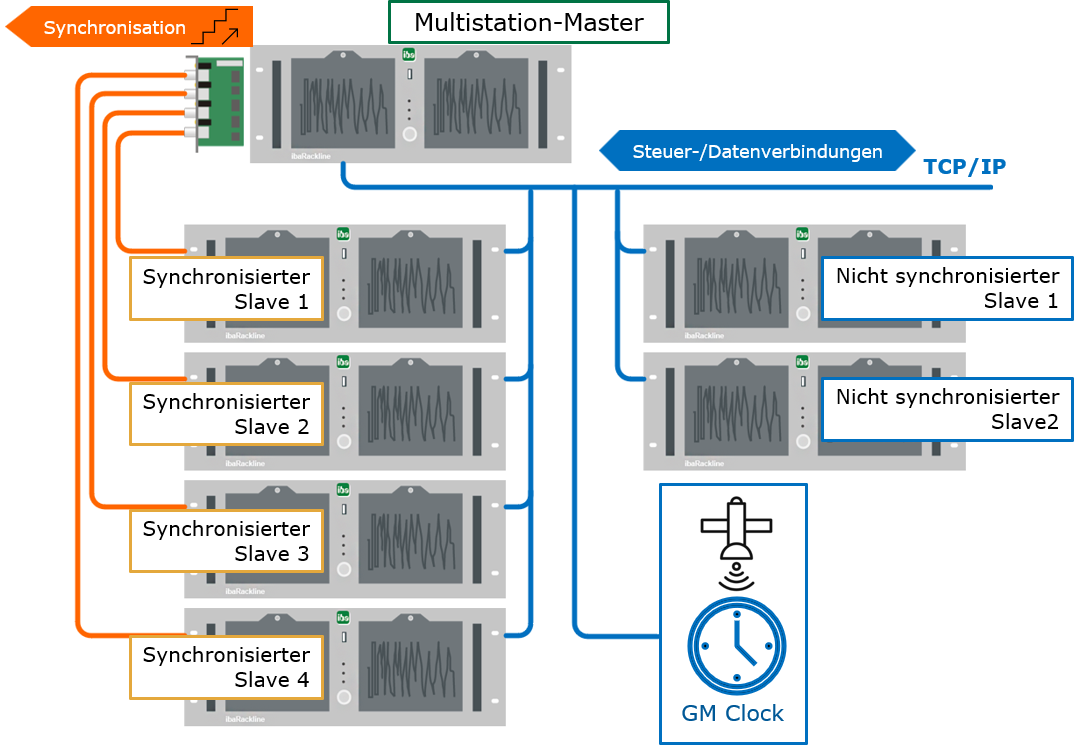 Der Master überträgt ein Taktsignal über die LWL-Verbindung, wodurch alle synchronisierten Teilnehmer genau zum gleichen Zeitpunkt Messwerte erfassen können. Dieser Takt wird zudem zur Synchronisation von Geräten der ibaPADU-S-Gerätefamilie verwendet, die an die synchronisierten Slaves angeschlossen sind.