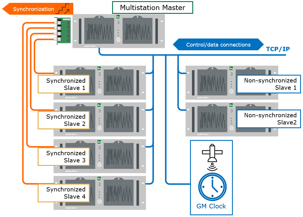 Besides the fiber optic synchronization connection, an Ethernet network is used between all systems. This establishes two different types of network connections:
