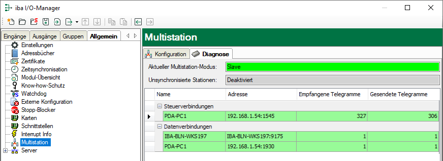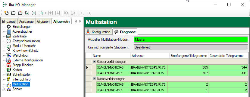 Im Register Diagnose vom Multistation-Zweig im I/O-Manager erhalten Sie Informationen über die Verbindungen der einzelnen Teilnehmer untereinander.