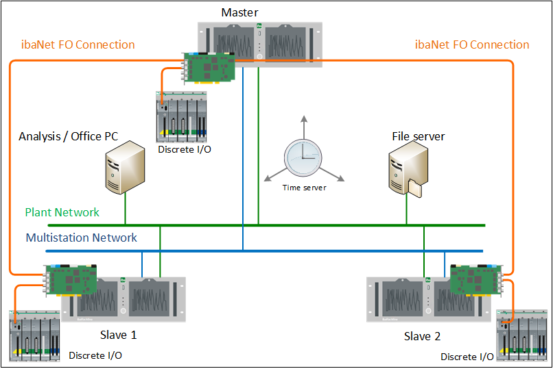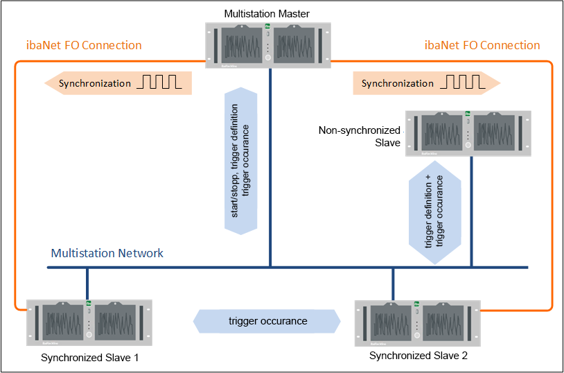 Multistation operation enables synchronous data acquisition across multiple ibaPDA systems and mutual control of data recording. Two modes are supported: synchronized and non-synchronized multistation operation. In a multistation configuration, one ibaPDA system is defined as the multistation master, while the remaining systems operate as synchronized or non-synchronized slaves. In synchronized operation, the master distributes a high-precision synchronization clock via FO connections and coordinates the start and stop of acquisition for synchronized slaves as well as trigger processing throughout the network.