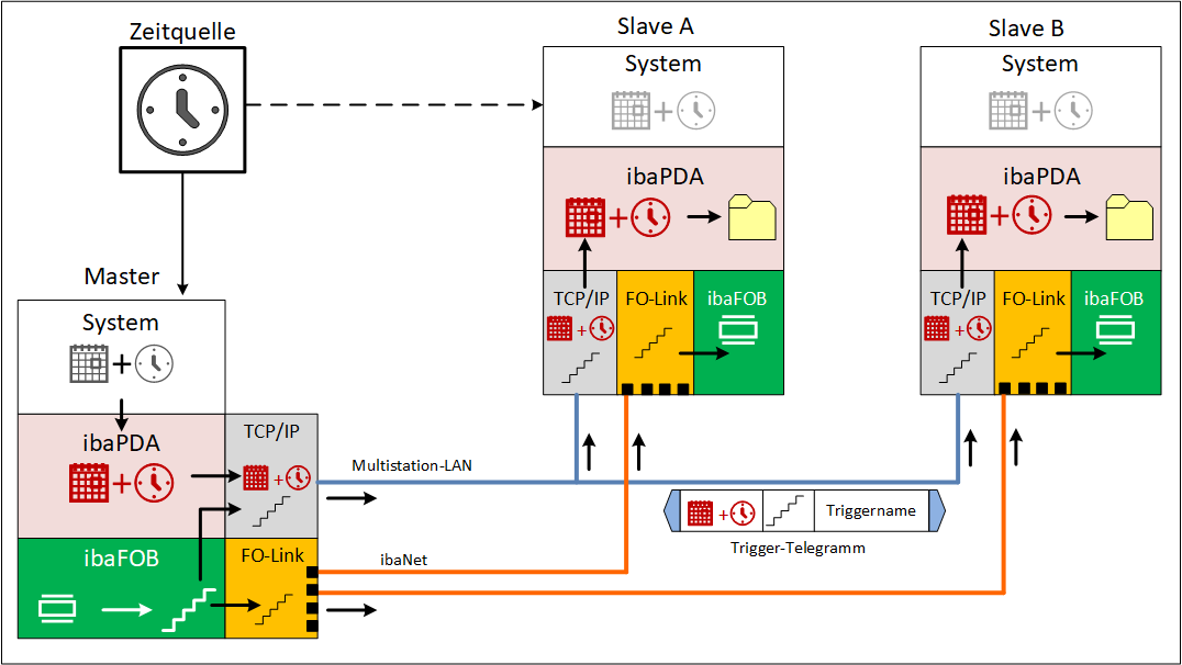 Im Multistation-Verbund synchronisiert der Master alle verbundenen Slaves über die ibaNet-LWL-Verbindung hinsichtlich der Messung. Die folgende Abbildung zeigt die Vorgänge im synchronisierten Betrieb schematisch.