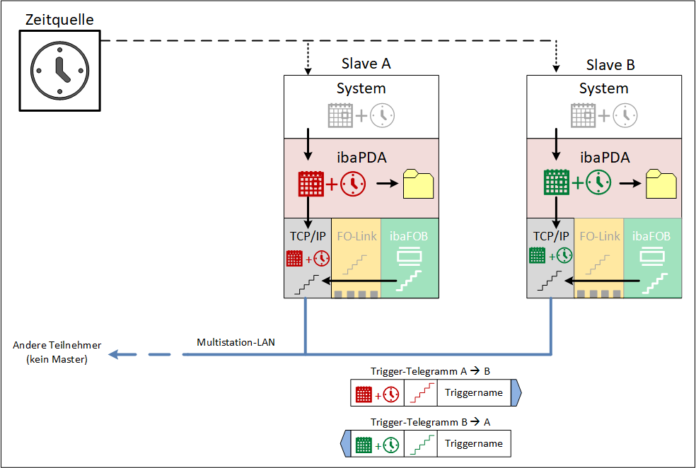 Für eine Kommunikation steht ausschließlich das Multistation-LAN zur Verfügung. Bei einem Triggerereignis sendet der betreffende Teilnehmer eine Nachricht, die neben dem Triggernamen noch den eigenen Taktzählerstand sowie das eigene Datum und die eigene Uhrzeit enthält.