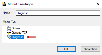 Wenn für eine Schnittstelle ein Diagnosemodul verfügbar ist, wird im Dialog Modul hinzufügen der Modultyp "Diagnose" angezeigt (Beispiel: Generic TCP).