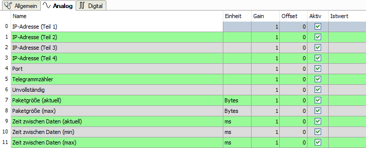 Die IP(v4-)-Adresse eines Generic TCP-Moduls, z. B. (siehe Abbildung), wird entsprechend der 4 Bytes bzw. Oktetts in 4 Teile zerlegt, um sie leichter lesen und vergleichen zu können. Andere Größen, wie Portnummer, Zählerstände für Telegramme und Fehler, Datengrößen und Laufzeiten für Telegramme werden ebenfalls ermittelt. Im nachfolgenden Beispiel sind die Digitalwerte eines Diagnosemoduls für ein Generic TCP-Modul aufgelistet.