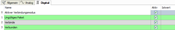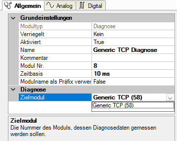 Mit der Auswahl des Zielmoduls weisen Sie das Diagnosemodul dem Modul zu, dessen Verbindungsinformationen erfasst werden sollen. Die Auswahlliste zeigt die unterstützten Module derselben Schnittstelle. Jedem Diagnosemodul können Sie genau ein Datenerfassungsmodul zuordnen. Wenn Sie ein Modul ausgewählt haben, werden in den Registern Analog und Digital sofort die verfügbaren Diagnosesignale hinzugefügt. Welche Signale das sind, hängt vom Schnittstellentyp ab. Im nachfolgenden Beispiel sind die Analogwerte eines Diagnosemoduls für ein Generic TCP-Modul aufgelistet.