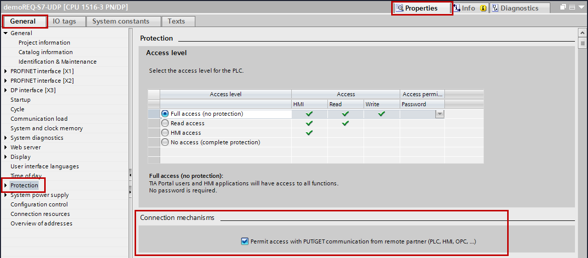 As of TIA Portal V19 and CPU firmware V3.1 (V4.7 for S7-1200), activate the PUT/GET access for S7-1500 and S7-1200 CPUs as follows:
