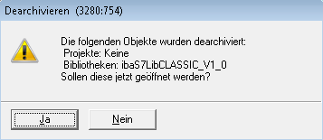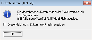 Um die Bibliothek einzubinden, müssen Sie die Bibliothek im SIMATIC Manager dearchivieren. Kopieren Sie die iba S7-Bibliothek in ein lokales Verzeichnis Ihres Rechners, auf dem SIMATIC Manager ausgeführt wird.
