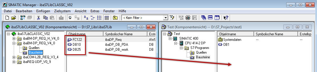 Öffnen Sie die Bibliothek über Datei – Öffnen – Bibliotheken, sowie das gewünschte Ziel-Projekt parallel.