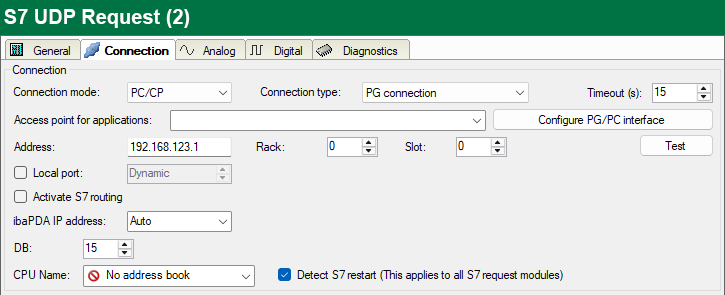 The current request configuration is stored in a data block on the CPU. In case the Detect S7 restart option is enabled, ibaPDA can detect if this data block has been deleted or overwritten, e.g. as a result of loading the offline program or due to a cold restart, and restarts the data acquisition. The configuration data are transferred again. This does not affect a warm restart of the CPU.