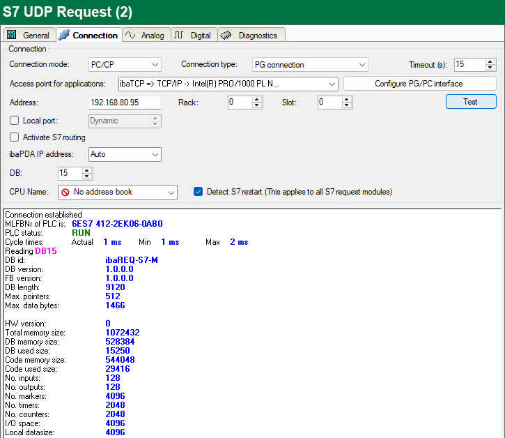 ibaPDA tests the connection to the CPU and displays available diagnostic data.