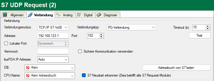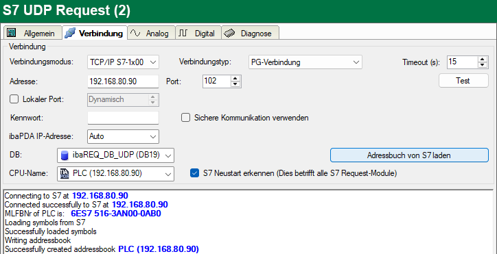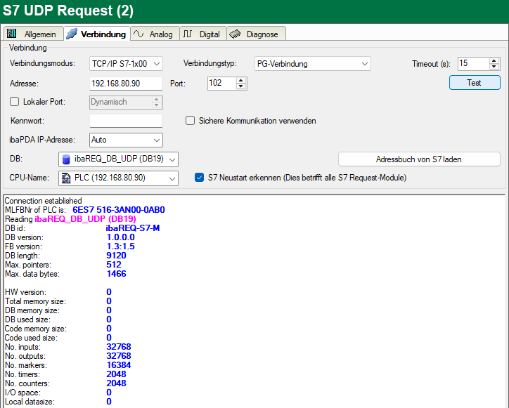 ibaPDA testet die Verbindung zur CPU und zeigt verfügbare Diagnosedaten an.
