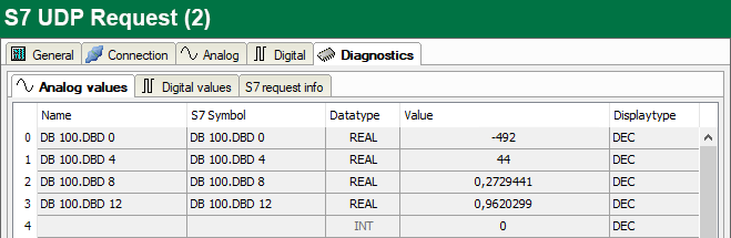 On the S7 request info subtab, you can view the data sent to the S7-CPU, and the data that are reported back as well as the general diagnostics data.