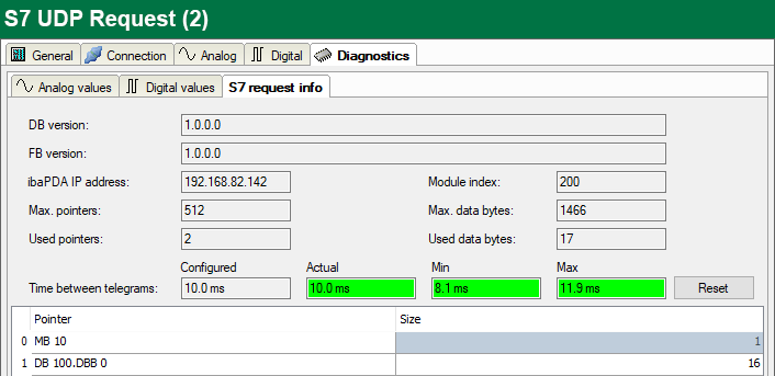 Configured: Corresponds to the setting Timebase on the General tab Actual: Time between the two last received telegrams Min: shortest time Max: longest time