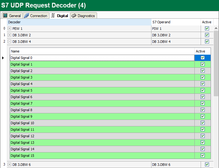 With the S7 UDP Request Decoder module, you can acquire up to 11728 digital signals, which are sent in form of a max. of 733 words (1466 Byte).