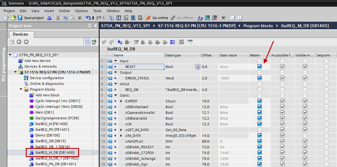 In the blocks folder, a data block ibaREQ_DB (DB15) has to be available for each Request module. Copy the data block and assign a new unique DB number.