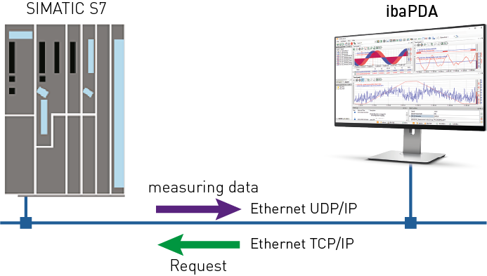 The ibaPDA-Request-S7-UDP interface is suitable for the measurement data acquisition with free variable selection over standard network cards via UDP. The measurement data is sent actively from the controller to ibaPDA. For this purpose, several Request blocks have to be integrated in the S7 program for each connection. These Request blocks are used to cyclically send the current values of the S7 operands selected by the user within ibaPDA to be recorded in ibaPDA. When modifying the signal selection, no modification in the S7 program is required.
