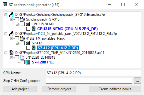Mark the CPUs you want to create the address books from and click on <Create address books>.
