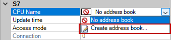 In the module configuration on the General tab under S7 – CPU Name: Select Create address book in the drop-down menu.