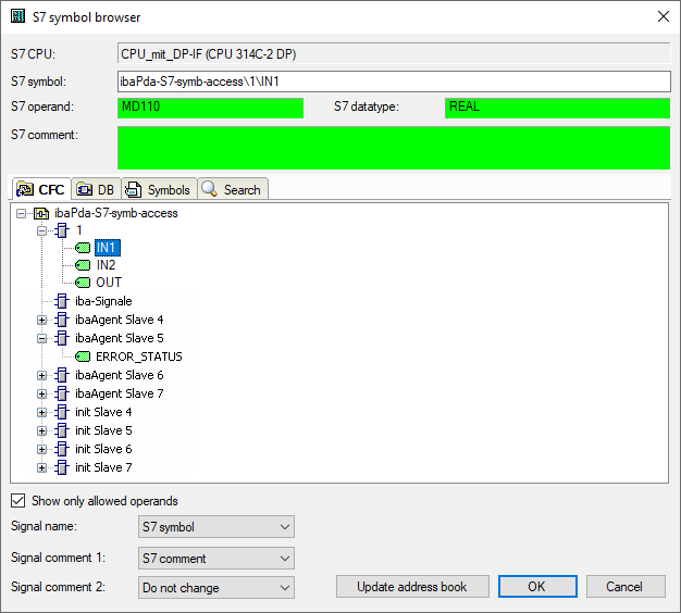 In order to select CFC connectors for the measurement, open the symbol browser first, see Selection via the symbolic operand addresses.