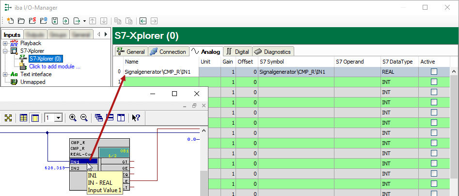 3. Drag the connector from the CFC editor into the desired line of the signal table in the I/O Manager of ibaPDA.