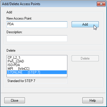 Define a new access point: Enter a name, e.g. "PDA", and optionally a description for a better understanding. Confirm your entries with <Add> and <Close>.