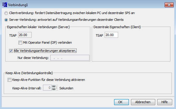Wählen Sie Server-Verbindung, tragen Sie einen TSAP ein (z. B. "20.00") und aktivieren Sie Alle Verbindungsanforderungen akzeptieren. Der verwendete TSAP und der in ibaPDA eingetragene TSAP müssen gleich sein, siehe Modul LOGO!.