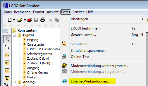 Wählen Sie Menü Extras – Ethernet-Verbindungen… in der LOGO!-Programmiersoftware.