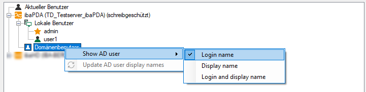 For the tree structure in the user management it is now possible to display the login name or the display name or both names of domain users (Active Directory users). Selection can be done in the context menu on the Domain users nodes.