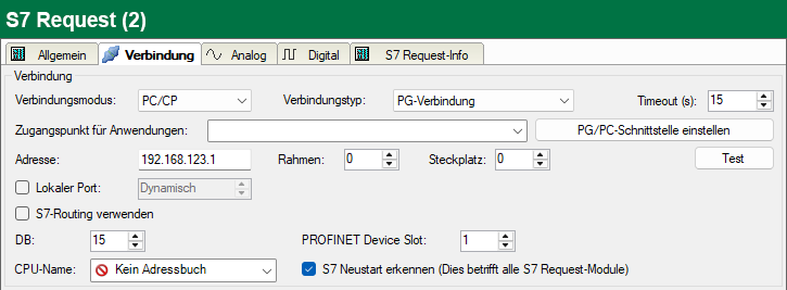 Die aktuelle Request-Konfiguration wird in einem Datenbaustein in der CPU gespeichert. Wird dieser gelöscht oder überschrieben, z. B. durch ein Laden des Offline-Programms oder durch einen Kaltstart, dann erkennt ibaPDA bei aktivierter Option S7 Neustart erkennen dies und startet die Datenerfassung neu. Hierbei werden die Konfigurationsdaten erneut übertragen. Ein CPU-Warmstart ist hiervon nicht betroffen.