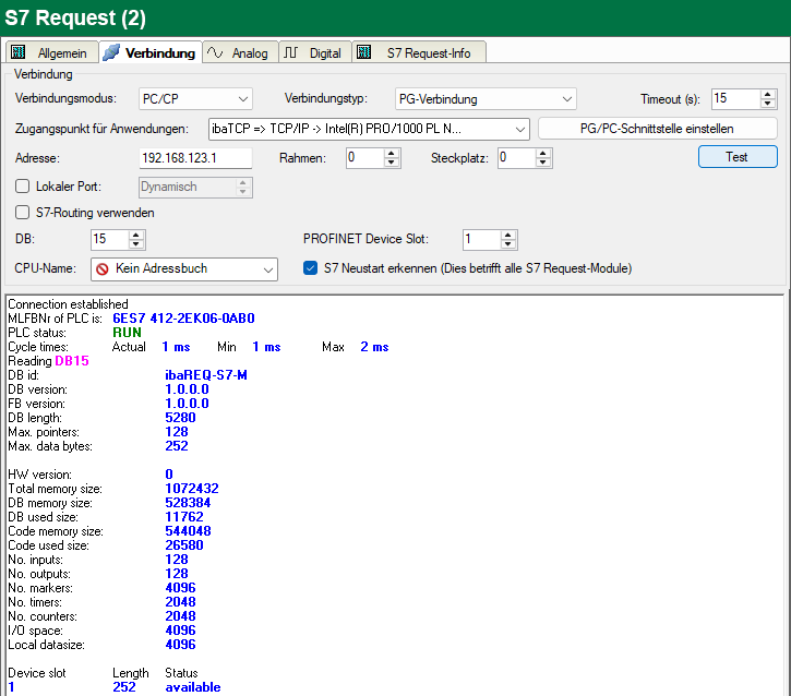ibaPDA testet die Verbindung zur CPU und zeigt verfügbare Diagnosedaten an.