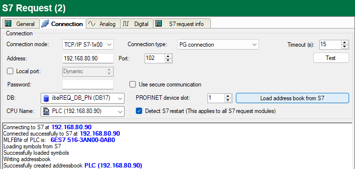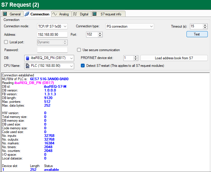 ibaPDA tests the connection to the CPU and displays available diagnostic data.